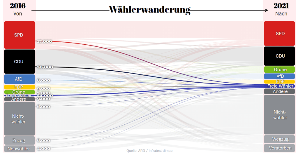 La leggera flessione di SPD e FDP è più che compensata dal buon risultato dei Verdi: la coalizione-semaforo della Ministerpräsidentin Malu Dreyer non è in discussione. Anche in questo caso è rilevante il calo di AfD, ma è spettacolare il tracollo della CDU, che sperava di poter trasformare la coalizione semaforo in una “coalizione Giamaica”, prendendo il posto della SPD alla guida del Land, e si ritrova invece a raccogliere i cocci.