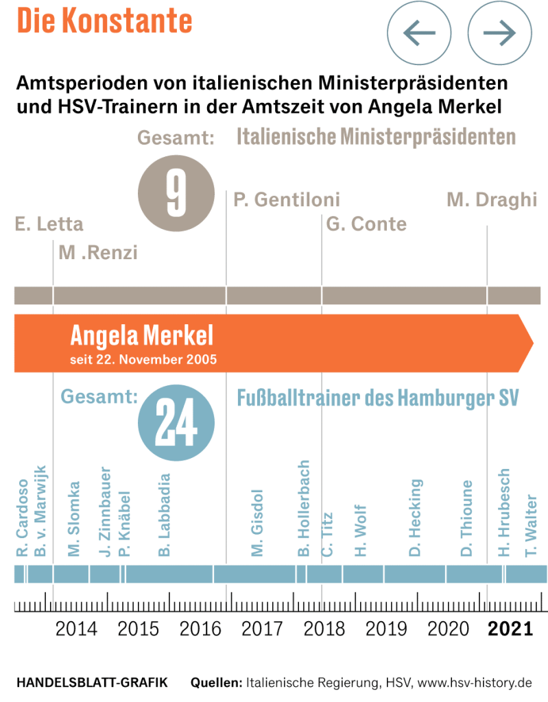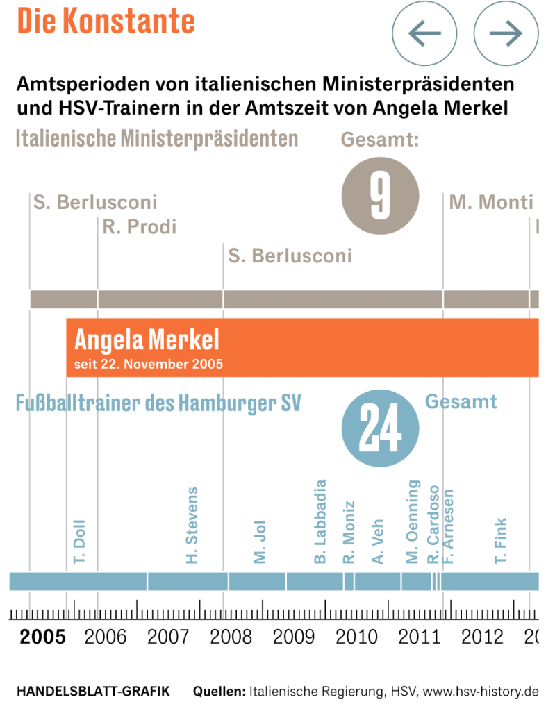 “La costante” è il titolo che il giornale economico Handeslblatt dà ad Angela Merkel, che nel suo lungo mandato si è confrontata con 9 Presidenti del Consiglio italiani diversi… e ben 24 allenatori dello Hamburger SV.