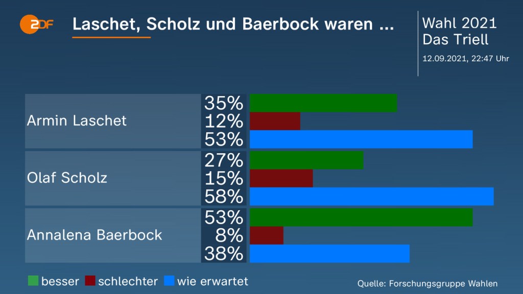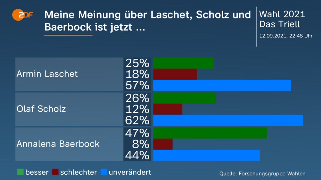 Il secondo triello fra i candidati alla Cancelleria, andato in onda domenica sera su ARD e ZDF, ha in buona parte confermato l’opinione che i tedeschi avevano dei tre contendenti. Una piccola eccezione è rappresentata da Annalena Berbock: la candidata verde, secondo un sondaggio realizzato subito dopo la trasmissione, è andata meglio del previsto per il 53% degli intervistati. Gli altri due, invece, hanno largamente confermato le attese.