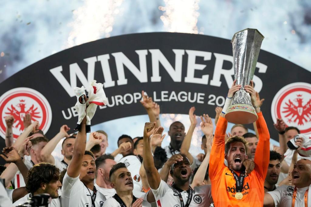 Da un paio di settimane però a questa immagine dobbiamo aggiungerne un’altra: insieme a Madrid e a Roma, Francoforte è ora anche una delle capitali europee del calcio. L’Eintracht Frankfurt, la squadra locale, ha disputato un campionato così così in Bundesliga, classificandosi undicesimo, ma ha trionfato in Europa League, uno dei tre trofei internazionali di questa stagione. Alla fine di una drammatica finale contro i Glasgow Rangers decisa ai calci di rigore, l’Eintracht ha riportato in Assia una coppa europea 42 anni dopo l’ultima volta, grazie soprattutto alle straordinarie parate di Kevin Trapp, eroe indiscusso della serata.