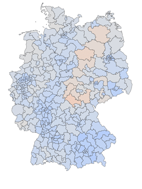 Qui invece vediamo la differenza di voti per AfD fra 2017 e 2021, entrambe elezioni per il rinnovo del Bundestag, il parlamento federale. Mentre quasi ovunque, a Sud come ad Ovest, i colori tendono al blu e segnalano un calo dei voti (la contrazione è livello nazionale è stata del -2,3%), solo in Mitteldeutschland compare quel colore rosato segno di un loro aumento. Tant’è che sia in Sassonia sia in Turingia il partito si è piazzato al primo posto (con rispettivamente il 24,6% ed il 24,0%) alle scorse elezioni federali. E proprio la Turingia, Land dirimpettaio della Sassonia e patria politica di Björn Höcke, “anima nera” dell’ala più intransigente della destra, è l’unico di tutti i 16 Länder nel quale AfD alle ultime elezioni non ha peggiorato, ma anzi migliorato il proprio risultato.