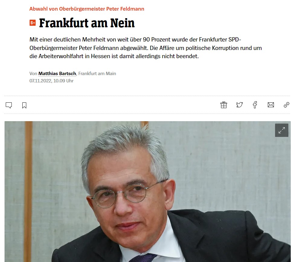 Domenica 6 novembre ai cittadini di Francoforte sul Meno è stato chiesto di esprimere il proprio parere sul sindaco della città, il socialdemocratico Peter Feldmann.