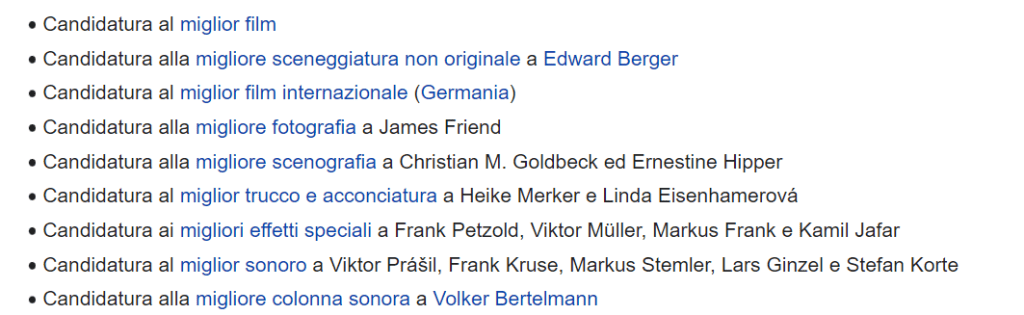 Nel 1979 trionfò Die Blechtrommel (“Il tamburo di latta”) di Volker Schlöndorff, anche questo un adattamento, certamente più aderente all’originale, di un celebre classico della letteratura tedesca; più recenti sono le affermazioni di Caroline Link con il suo Nirgendwo in Afrika (“Nowhere in Africa”) del 2002 e di Florian Henckel von Donnersmarck con Das Leben der Anderen (“Le vite degli altri”) del 2006. Tra i tanti che invece non ce l’hanno fatta, è doveroso citare almeno Das weiße Band (“Il nastro bianco”) di Michael Haneke e Toni Erdmann di Maren Ade.