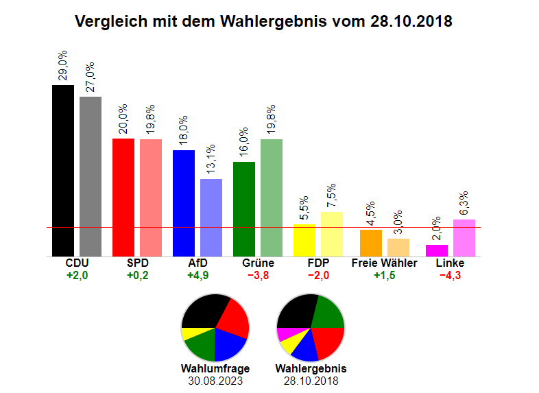 Nei sondaggi il calo dei Grünen sembra essere compensato dal leggero guadagno della CDU. Non sembrano quindi esserci seri ostacoli sulla strada di un nuovo governo nero-verde, guidato dal Ministerpräsident uscente Boris Rhein, subentrato nel maggio di un anno fa a Volker Bouffier.