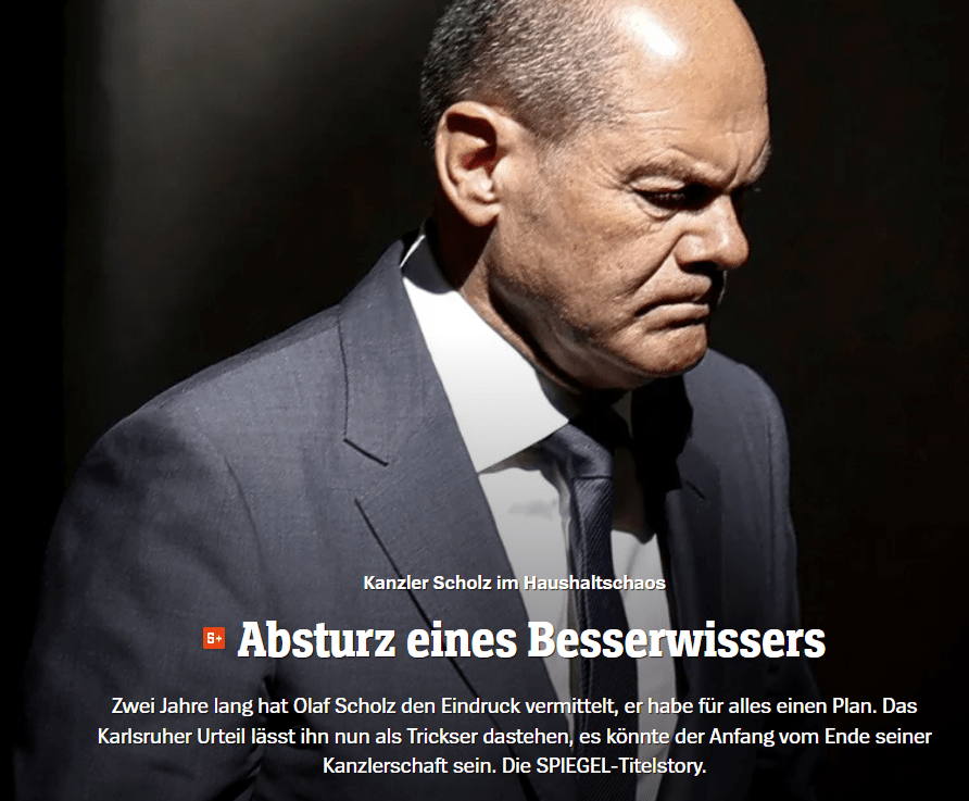 Definire questa faccenda dei 60 miliardi un nuovo grattacapo sarebbe eufemistico. Per molti osservatori potrebbe essere davvero la goccia che fa traboccare il vaso, sia nella coalizione semaforo che nell’opinione pubblica, in cui si fa sempre più strada l’impressione che al governo ci sia un branco di incapaci. Il colpo è particolarmente doloroso per il Cancelliere Olaf Scholz, che ha costruito buona parte della sua popolarità come Ministro delle Finanze durante l’ultimo governo Merkel e si trova ora a fare la figura di chi non sa da che parte girarsi. Lo mostra abbastanza chiaramente la copertina dello Spiegel: “La caduta di un saputello – Come Olaf Scholz guida il Paese verso il caos finanziario”.