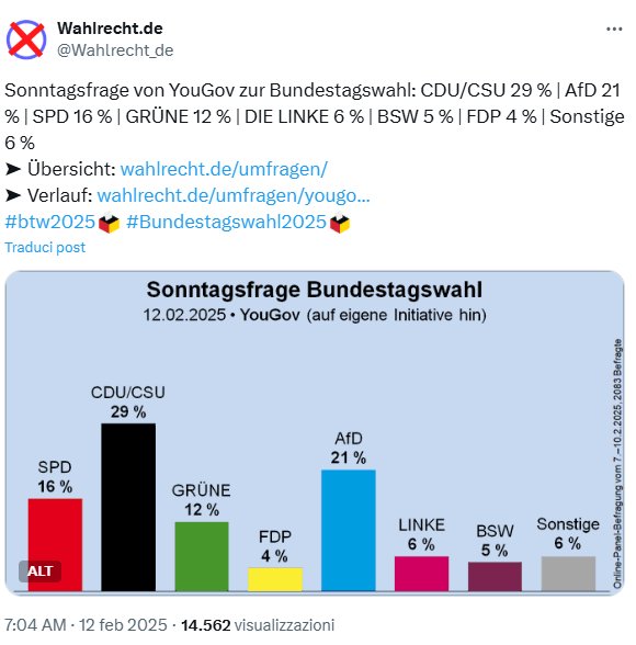 Per quanto riguarda le prospettive, il discorso per l’Union è molto semplice: o si arriva alla Cancelleria, oppure è un disastro, per certi versi ancora peggiore rispetto al 2021, perché allora la vittoria, per quanto probabile, non era data per certa come invece lo è oggi. Prendere meno del 30%, dopo quattro anni di un governo semaforo che ha battuto tutti i record di impopolarità, sarebbe un colpo durissimo per Merz, perché metterebbe in dubbio in maniera probabilmente definitiva la sua capacità di incarnare un nuovo corso di successo per la CDU. Con chi governare è un punto di importanza relativa, la cosa fondamentale è riprendersi la Cancelleria.