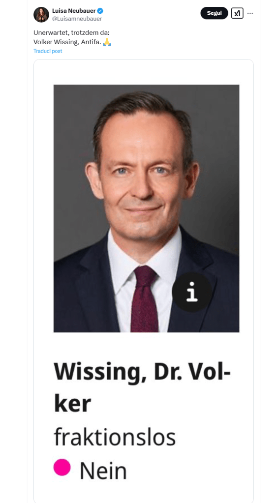 Ai comizi di Lindner in giro per il Paese spuntano ormai come funghi i cartelli di protesta “Team Volker Wissing”, ancora di più dopo il famigerato voto del 29 gennaio sulla mozione di Friedrich Merz. In quell’occasione Wissing aveva votato contro, a differenza del suo ex partito: una circostanza che non è passata inosservata. Tanto che a celebrare l’eroe inatteso è arrivata anche Luisa Neubarer, leader tedesca del movimento Fridays for Future, che sul suo profilo Twitter gli ha dedicato un breve haiku:
