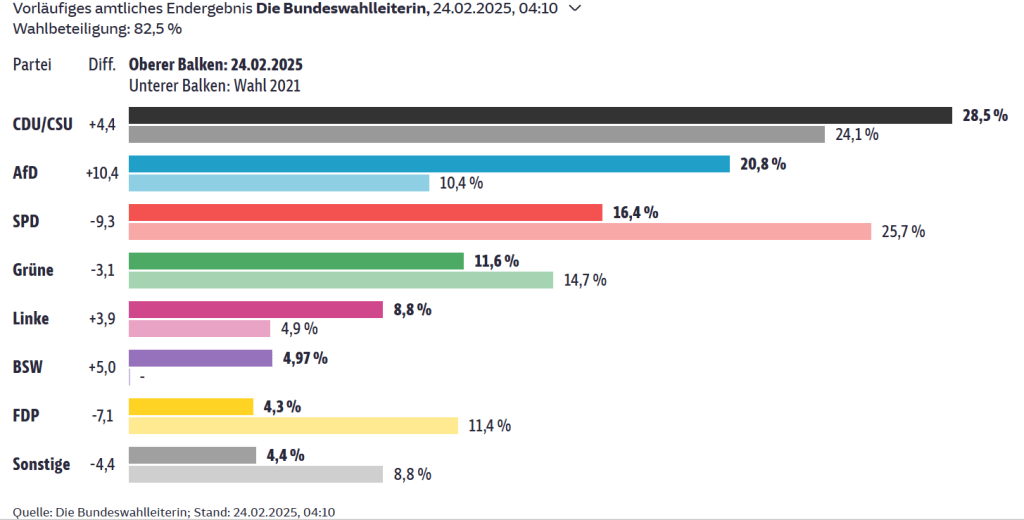 Fra i socialdemocratici decimati e i liberali spazzati via, i Grünen non possono lamentarsi eccessivamente. Certo, non è un bel risultato, hanno perso tre punti rispetto al 2021, ma considerato il periodo da cui venivano e soprattutto com’e andata agli altri due compagni di coalizione nel governo semaforo, per una percentuale così non dico che ci avrebbero messo la firma, ma quasi. Certo è un brusco risveglio, dopo il sogno di far parte del governo che, sulla carta, si presentava come il più innovativo della storia tedesca recente e si riprometteva di rivoltare la Germania come un calzino. Secondo molti il merito di questa sconfitta contenuta è soprattutto di Robert Habeck, in grado di mantenere tassi di popolarità non catastrofici mentre i suoi compagni di governo andavano in pezzi sempre più minuscoli. Il candidato verde è riuscito sia a presentarsi come un’alternativa (più o meno) credibile, sia a non posizionarsi in maniera troppo esplicita in contrapposizione totale a Friedrich Merz, lasciandosi aperta una porticina per un’eventuale chiamata al tavolo delle trattative – porticina che però con un Bundestag senza FDP e BSW sembrerebbe essersi subito richiusa, perché con questi numeri una Grosse Koalition fra Union e SPD è sufficiente per governare, pur con una maggioranza sottile.